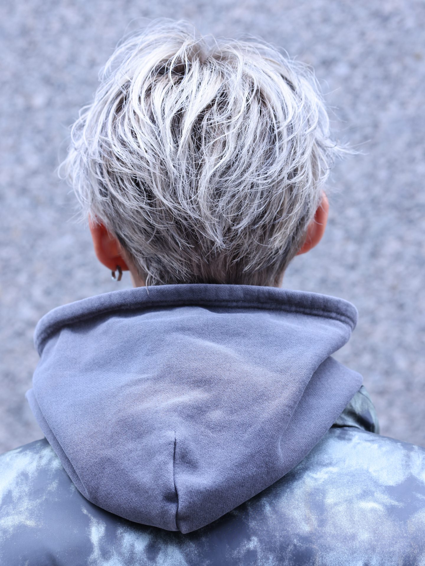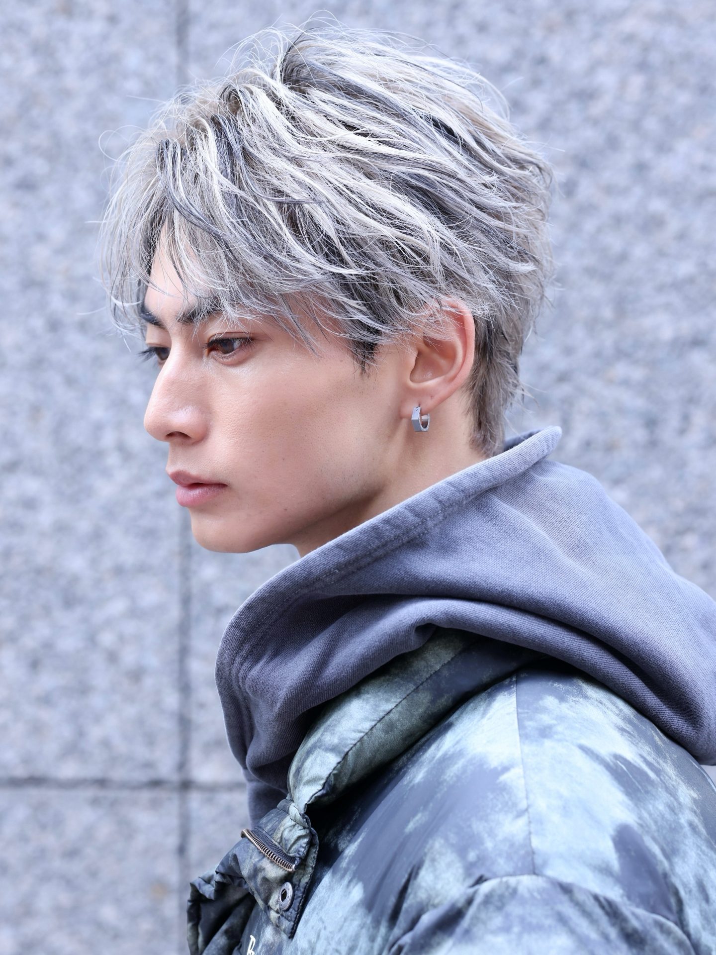 センターパートにシルバーカラーで透明感を出した、都会的なセンターパート