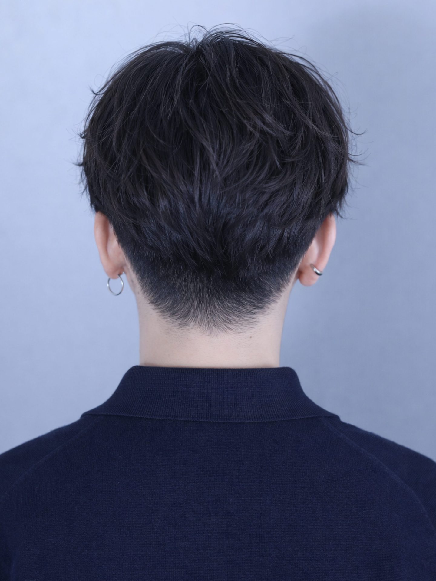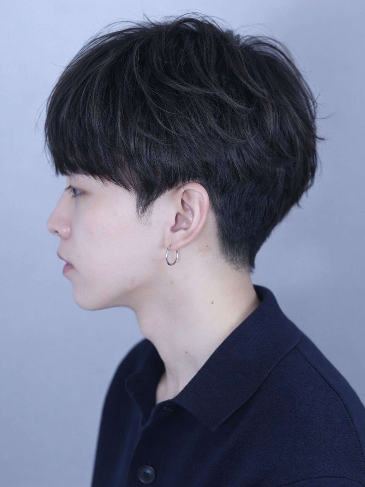 ツーブロックと刈り上げを入れたマッシュベースのカット。前髪はまっすぐ下ろして目に少しかかる長さ、顔まわりは前髪より1センチ長く設定しています。