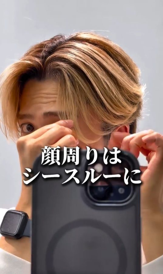 - 顔周りの毛束を指でつまみ、横に割いてシースルーに仕上げる