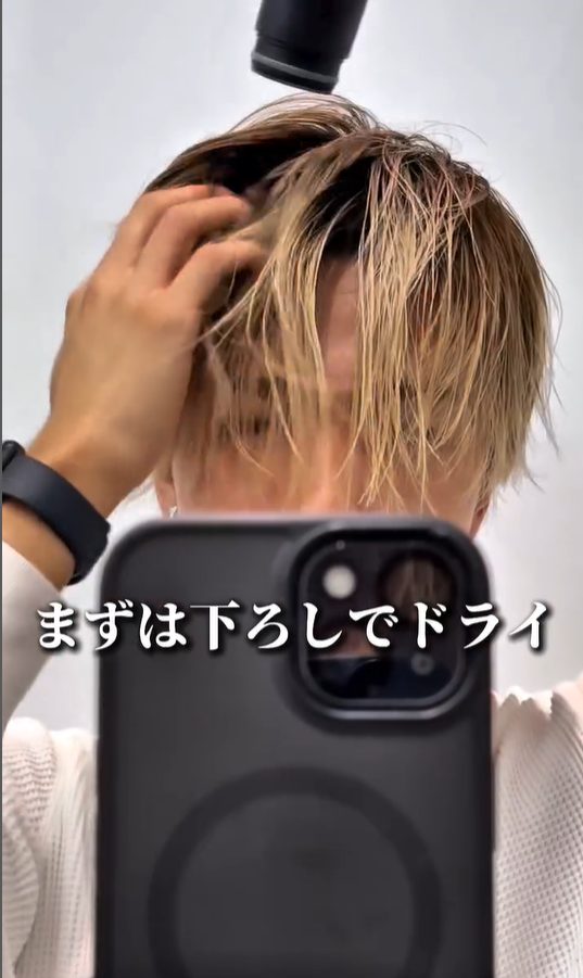 - 髪を下ろしてドライヤーで乾かす