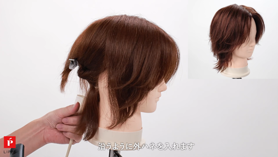 バックアンダーは、正面から見た際にハネがしっかり分かるよう、後ろに流さず首に沿わせて外ハネを入れます。