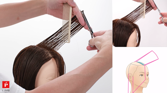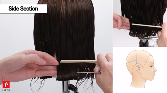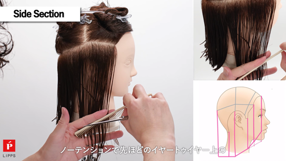 サイドもバック同様、ノーテンションでボブラインをしっかり見つけて前上がりにカットしていきます。