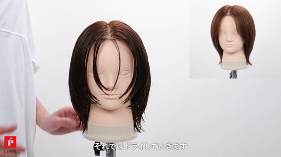 今回、ネープはくびれるようにダウンステムにし、肩上で跳ねるようイヤートゥイヤー付近へフォワード気味のダウンで乾かします。