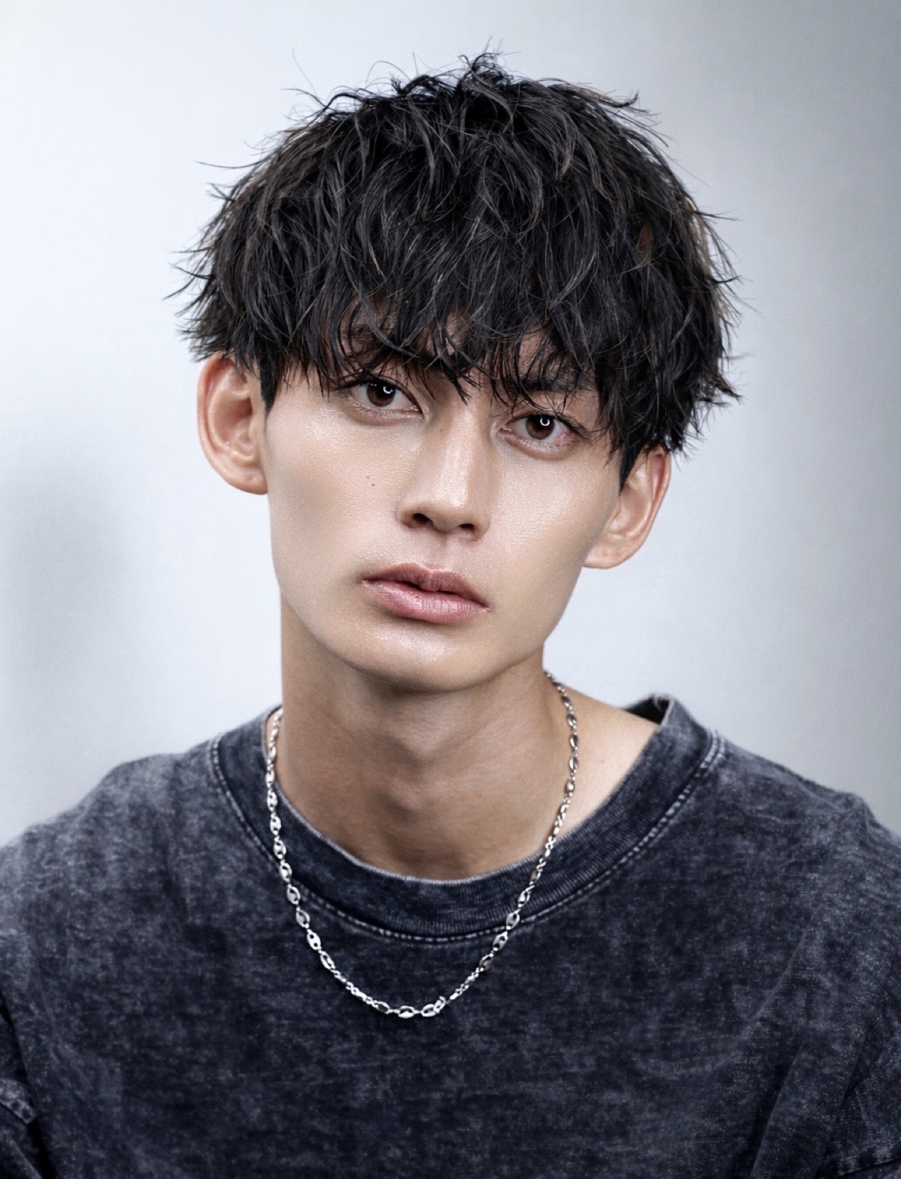 レイヤーと質感調整で、ラフな束感が自然に出るマッシュヘアスタイル。