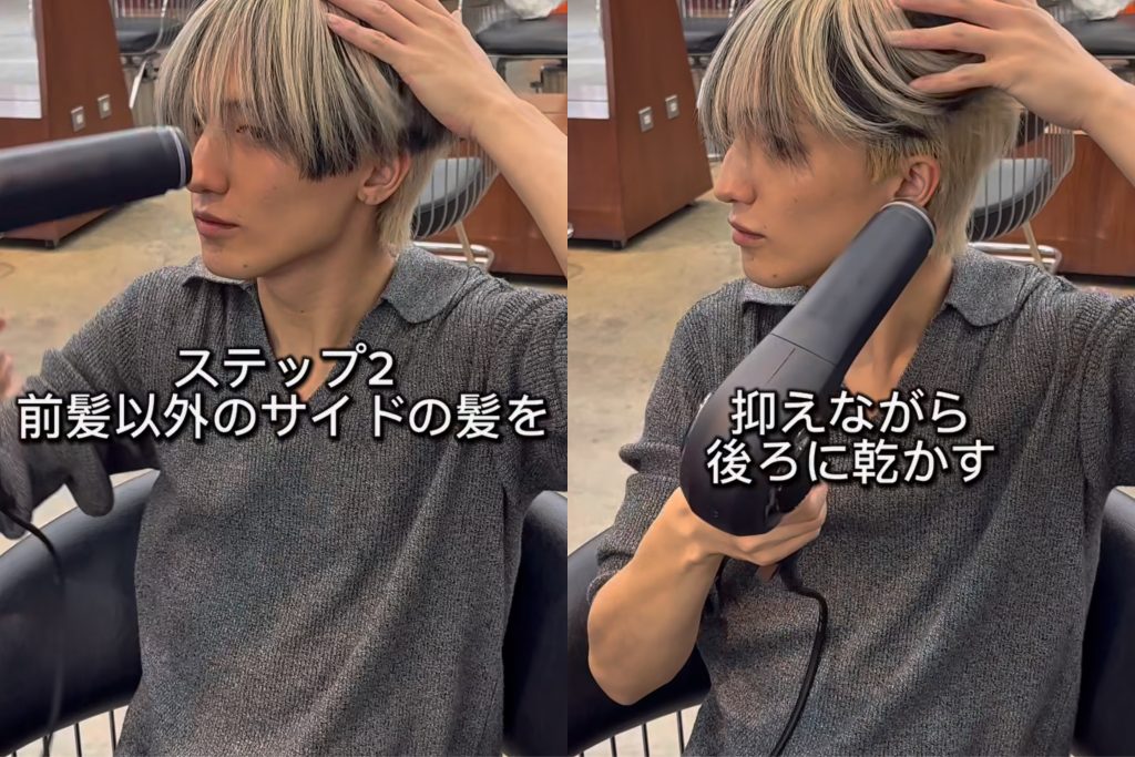 前髪以外のサイドの髪を抑えながら乾かす