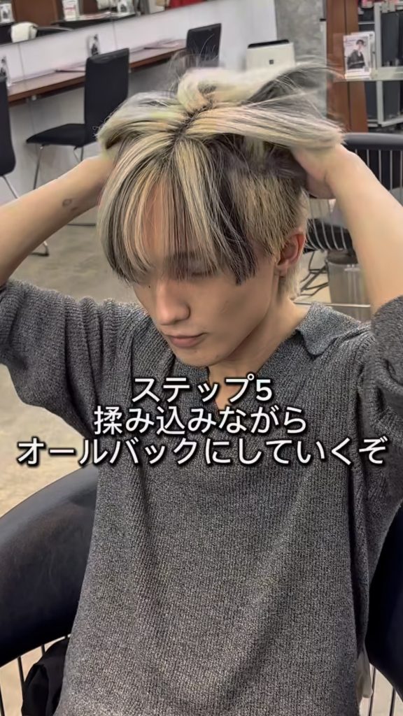 スタイリング剤を揉みこみながらオールバックにしていく